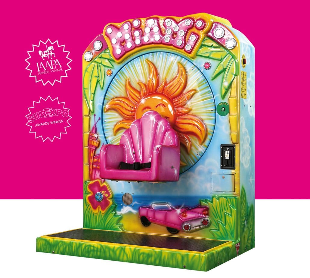 Детский аттракцион Miami 660 – качалка для малышей в возрасте от 2 до 7 лет. Катание происходит в круговом направлении, причем как по часовой стрелке, так и против. Ребенок сидит в ярком розовом кресле, оснащенном ремнем безопасности, и передвигается вокруг яркого солнышка, нарисованного на стене. Вокруг него пальмы, рядом кабриолет и бескрайнее море. Катание сопровождается звуковыми эффектами. Качалку можно в любой момент остановить кнопками на пульте. А если кто-то захочет забраться на аттракцион во время движения, сработают датчики безопасности. Аттракцион высокий, но достаточно компактный и не требует много места для установки.