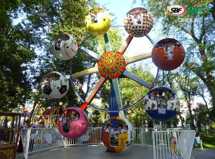 Колесо обозрения Flying Balls Mod. 706 привлекает внимание необычным видом. Кабинки для катания в количестве 8 штук имеют форму шара или мяча. Они круглые, каждая имеет свой собственный дизайн. Внутри достаточно места для 4 детей или для ребенка в сопровождении взрослого. Кабинки полуоткрытые, но обзор из них на две стороны достаточно большой. Безопасность обеспечивают металлические высокие калитки. Такой аттракцион несомненно понравится детям не только возможностью прокатиться и с высоты посмотреть на округу, но также шансом побывать внутри мяча. Колесо очень красочное, дополнено светодиодной подсветкой. Оно будет хорошо смотреться в парке развлечений любой тематики.